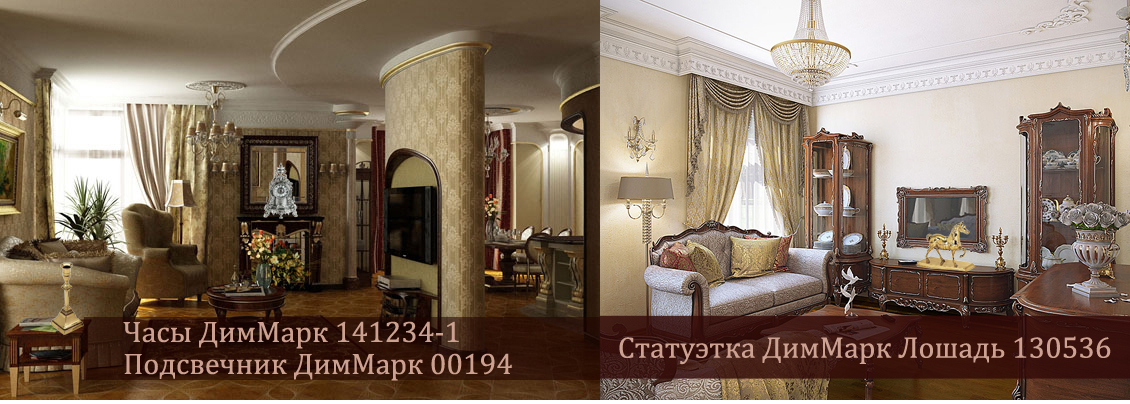 На фото ниже мы разместили два классических интерьера гостиной, где можно увидеть часы из латуни каминные в серебряном цвете ДимМарк 141234-1, подсвечник ДимМарк 00194, преднанзаченный для одной свечи, он будет согревать атмосферу теплом огня. Во втором классическом интерьере в современной интерпретации. можно заметить статуэтку из латуни ДимМарк Лошадь 130536. Она прекрасно впишется на консольный столик в окружении канделябров из латуни.
