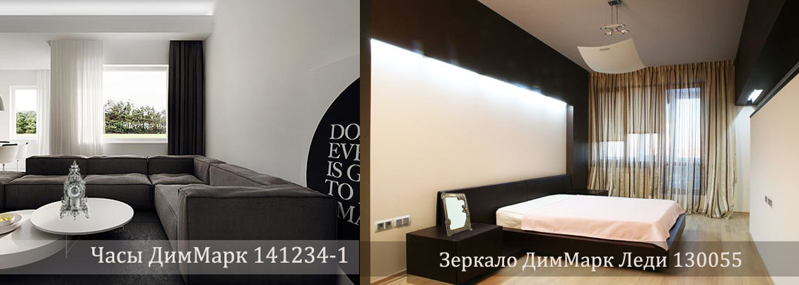 Два интерьера в стиле минимализм в разных цветовых гаммах: теплой и холодной. Мы хотели показать, что роскошь изделий из латуни и бронзы может вписаться даже в холодных интерьер минимализма в серых цветах, если это будет серебряный цвет, в данном случае серебряные часы ДимМарк 141234-1. На втором фото мы расположили настольное зеркало из латуни в цвете античная бронза ДимМарк Леди 130055. В обоих случаях латунь облагораживает интерьер, делает завершенным и более уютным.